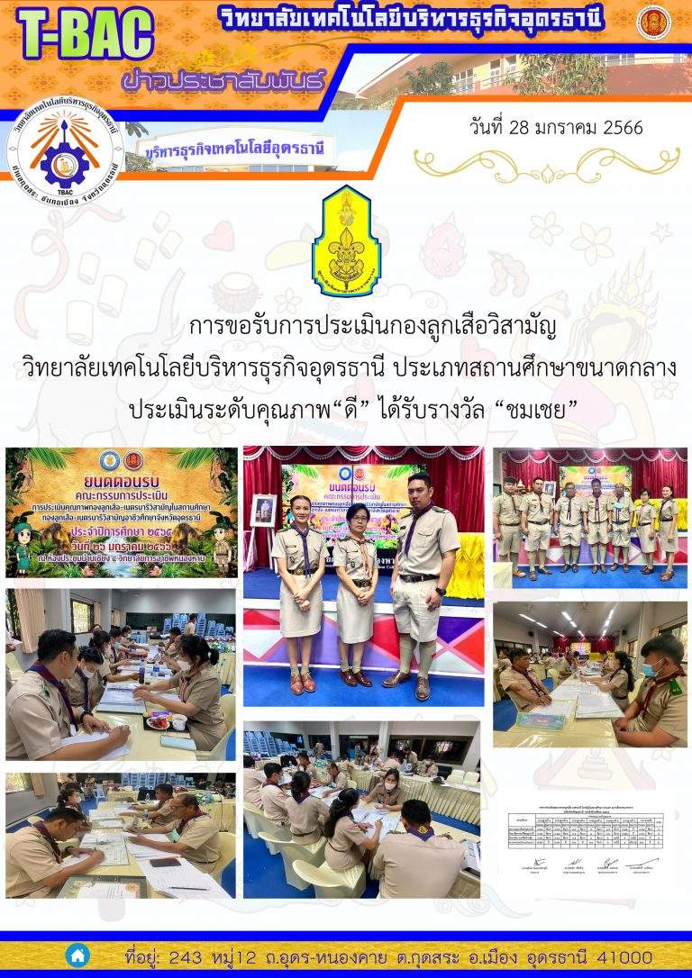 การขอรับการประเมินกองลูกเสือวิสามัญ วิทยาลัยเทคโนโลยีบริหารธุรกิจอุดรธานี ประเภทสถานศึกษาขนาดกลาง ประเมินระดับคุณภาพ“ดี” ได้รับรางวัล “ชมเชย”