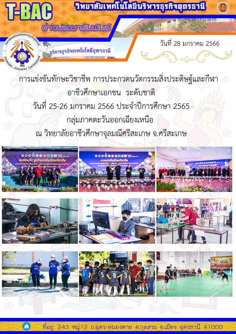 การแข่งขันทักษะวิชาชีพ การประกวดนวัตกรรมสิ่งประดิษฐ์และกีฬา อาชีวศึกษาเอกชน ระดับชาติ วันที่ 25-26 มกราคม 2566 ประจำปีการศึกษา 2565 กลุ่มภาคตะวันออกเฉียงเหนือ ณ วิทยาลัยอาชีวศึกษาจุลมณีศรีสะเกษ จ.ศรีสะเกษ