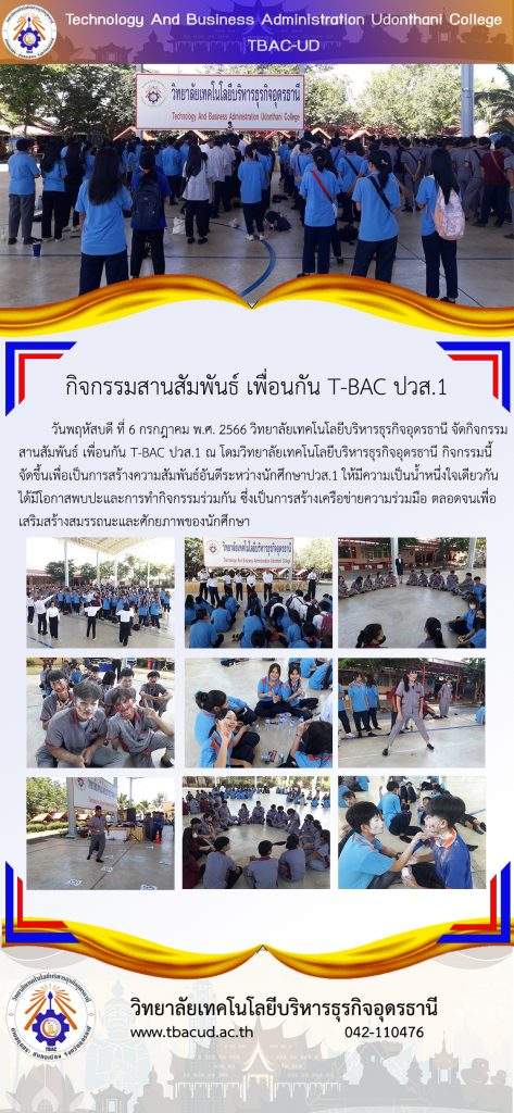 วันพฤหัสบดี ที่ 6 กรกฎาคม พ.ศ. 2566 วิทยาลัยเทคโนโลยีบริหารธุรกิจอุดรธานี จัดกิจกรรมสานสัมพันธ์ เพื่อนกัน T-BAC ปวส.1 ณ โดมวิทยาลัยเทคโนโลยีบริหารธุรกิจอุดรธานี กิจกรรมนี้จัดขึ้นเพื่อเป็นการสร้างความสัมพันธ์อันดีระหว่างนักศึกษาปวส.1 ให้มีความเป็นน้ำหนึ่งใจเดียวกัน ได้มีโอกาสพบปะและการทำกิจกรรมร่วมกัน ซึ่งเป็นการสร้างเครือข่ายความร่วมมือ ตลอดจนเพื่อเสริมสร้างสมรรถนะและศักยภาพของนักศึกษา