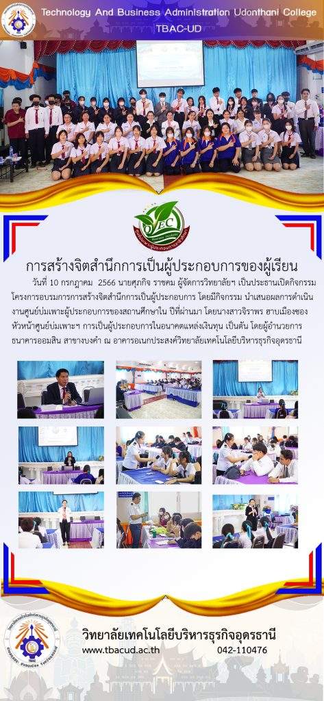 วันที่ 10 กรกฎาคม 2566 นายศุภกิจ ราชคม ผู้จัดการวิทยาลัยฯ เป็นประธานเปิดกิจกรรมโครงการอบรมการการสร้างจิตสำนึกการเป็นผู้ประกอบการ โดยมีกิจกรรม นำเสนอผลการดำเนินงานศูนย์บ่มเพาะผู้ประกอบการของสถานศึกษาใน ปีที่ผ่านมา โดยนางสาวจิราพร ฮาบเมืองซองหัวหน้าศูนย์บ่มเพาะฯ การเป็นผู้ประกอบการในอนาคตแหล่งเงินทุน เป็นตัน โดยผู้อำนวยการธนาคารออมสิน สาขางบงคำ ณ อาคารอเนกประสงค์ วิทยาลัยเทคโนโลยีบริหารธุรกิจอุดรธานี