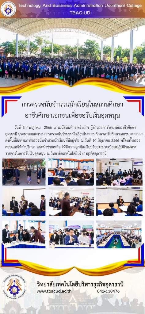 วันที่ 6 กรกฎาคม 2566 คณะกรรมการตรวจนับจำนวนนักเรียนในสถานศึกษาอาชีวศึกษาเอกชน ลงพื้นที่ติดตามการตรวจนับจำนวนนักเรียนที่มีอยู่จริง ณ วันที่ 10 มิถุนายน 2566 โดยมี นางมนัสนันท์ ราตรีหว่าง ผู้อำนวยการวิทยาลัยอาชีวศึกษาอุดรธานี เป็นประธานคณะกรรมการ พร้อมทั้งตรวจสอบและให้คำปรึกษา แนะนำช่วยเหลือ ให้มีความถูกต้องเรียบร้อยตามระเบียบปฏิบัติของทางราชการในการรับเงินอุดหนุน ณ วิทยาลัยเทคโนโลยีบริหารธุรกิจอุดรธานี