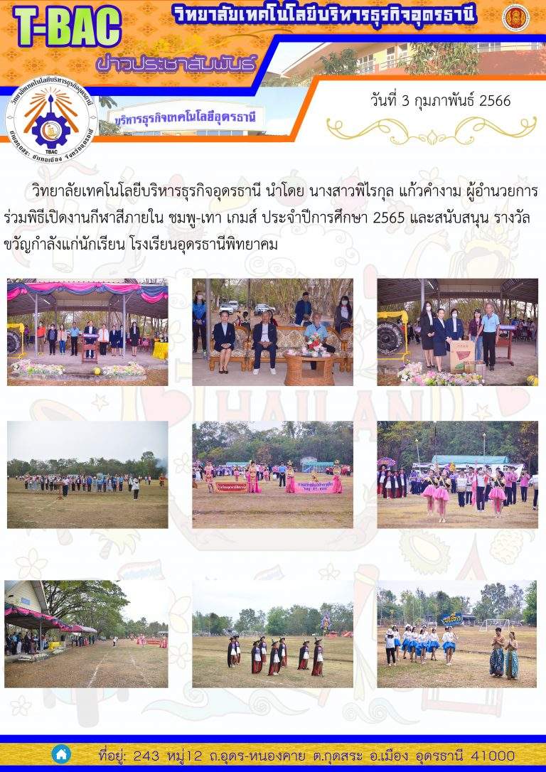 วิทยาลัยเทคโนโลยีบริหารธุรกิจอุดรธานี นำโดย นางสาวพิไรกุล แก้วคำงาม ผู้อำนวยการ ร่วมพิธีเปิดงานกีฬาสีภายใน ชมพู-เทา เกมส์ ประจำปีการศึกษา 2565 และสนับสนุน รางวัล ขวัญกำลังแก่นักเรียน โรงเรียนอุดรธานีพิทยาคม