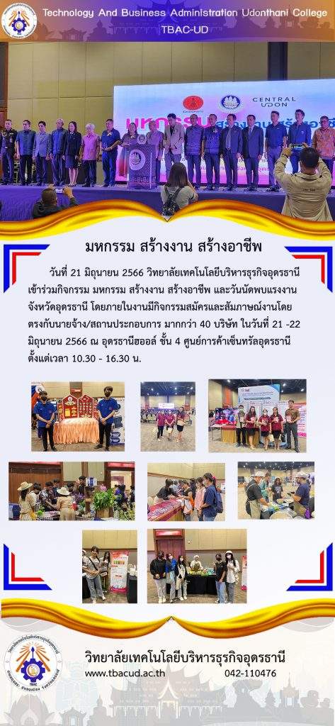 วิทยาลัยเทคโนโลยีบริหารธุรกิจอุดรธานีเข้าร่วมกิจกรรม มหกรรม สร้างงาน สร้างอาชีพ และวันนัดพบแรงงานจังหวัดอุดรธานี โดยภายในงานมีกิจกรรมสมัครและสัมภาษณ์งานโดยตรงกับนายจ้าง/สถานประกอบการ มากกว่า 40 บริษัท ในวันที่ 21 -22มิถุนายน 2566 ณ อุดรธานีฮออล์ ชั้น 4 ศูนย์การค้าเซ็นทรัลอุดรธานี
