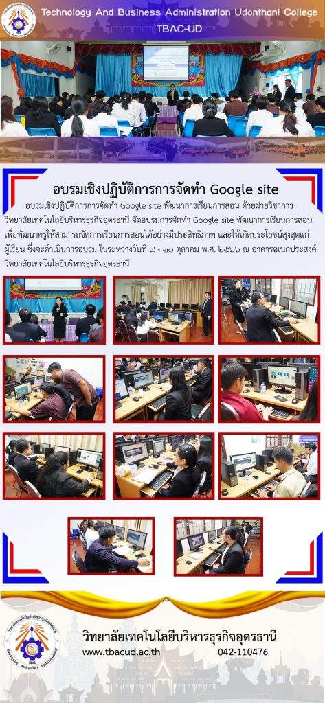 อบรมเชิงปฏิบัติการการจัดทำ Google site พัฒนาการเรียนการสอน ด้วยฝ่ายวิชาการ วิทยาลัยเทคโนโลยีบริหารธุรกิจอุดรธานี จัดอบรมการจัดทำ Google site พัฒนาการเรียนการสอน เพื่อพัฒนาครูให้สามารถจัดการเรียนการสอนได้อย่างมีประสิทธิภาพ และให้เกิดประโยชน์สุงสุดแก่ ผู้เรียน ซึ่งจะดำเนินการอบรม ในระหว่างวันที่ ๙ – ๑๐ ตุลาคม พ.ศ. ๒๕๖๖ ณ อาคารอเนกประสงค์ วิทยาลัยเทคโนโลยีบริหารธุรกิจอุดรธานี