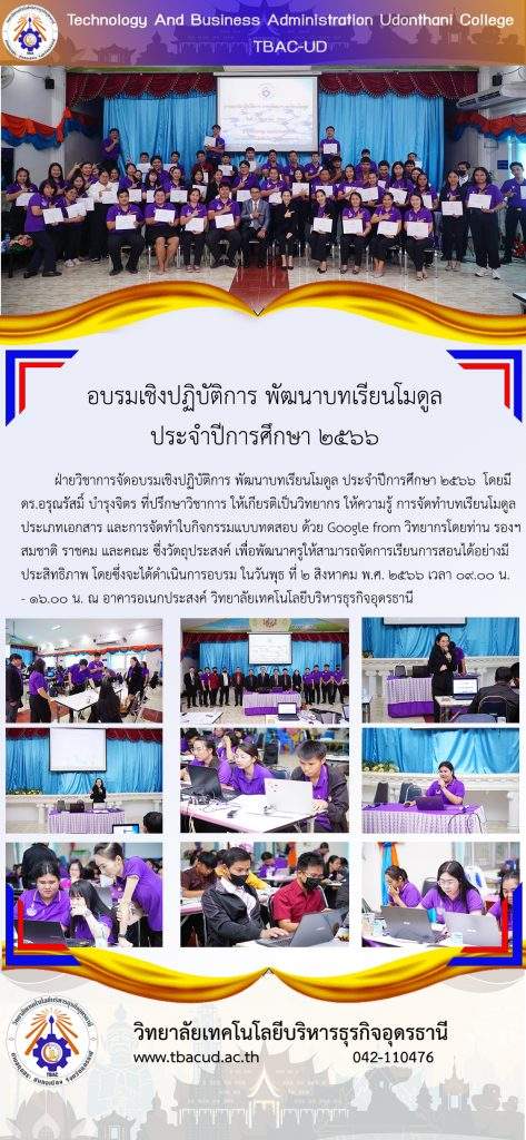 ฝ่ายวิชาการจัดอบรมเชิงปฏิบัติการ พัฒนาบทเรียนโมดูล ประจำปีการศึกษา ๒๕๖๖ โดยมี ดร.อรุณรัสมิ์ บำรุงจิตร ที่ปรึกษาวิชาการ ให้เกียรติเป็นวิทยากร ให้ความรู้ การจัดทำบทเรียนโมดูลประเภทเอกสาร และการจัดทำใบกิจกรรมแบบทดสอบ ด้วย Google from วิทยากรโดยท่าน รองฯสมชาติ ราชคม และคณะ ซึ่งวัตถุประสงค์ เพื่อพัฒนาครูให้สามารถจัดการเรียนการสอนได้อย่างมีประสิทธิภาพ โดยซึ่งจะได้ดำเนินการอบรม ในวันพุธ ที่ ๒ สิงหาคม พ.ศ. ๒๕๖๖ เวลา ๐๙.๐๐ น. – ๑๖.๐๐ น. ณ อาคารอเนกประสงค์ วิทยาลัยเทคโนโลยีบริหารธุรกิจอุดรธานี