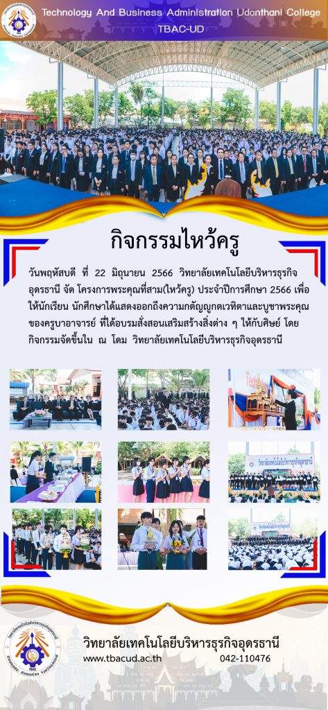 วันพฤหัสบดี ที่ 22 มิถุนายน 2566 วิทยาลัยเทคโนโลยีบริหารธุรกิจอุดรธานี จัด โครงการพระคุณที่สาม(ไหว้ครู) ประจำปีการศึกษา 2566 เพื่อให้นักเรียน นักศึกษาได้แสดงออกถึงความกตัญญูกตเวทิตาและบูชาพระคุณของครูบาอาจารย์ ที่ได้อบรมสั่งสอนเสริมสร้างสิ่งต่าง ๆ ให้กับศิษย์ โดยกิจกรรมจัดขึ้นใน ณ โดม วิทยาลัยเทคโนโลยีบริหารธุรกิจอุดรธานี